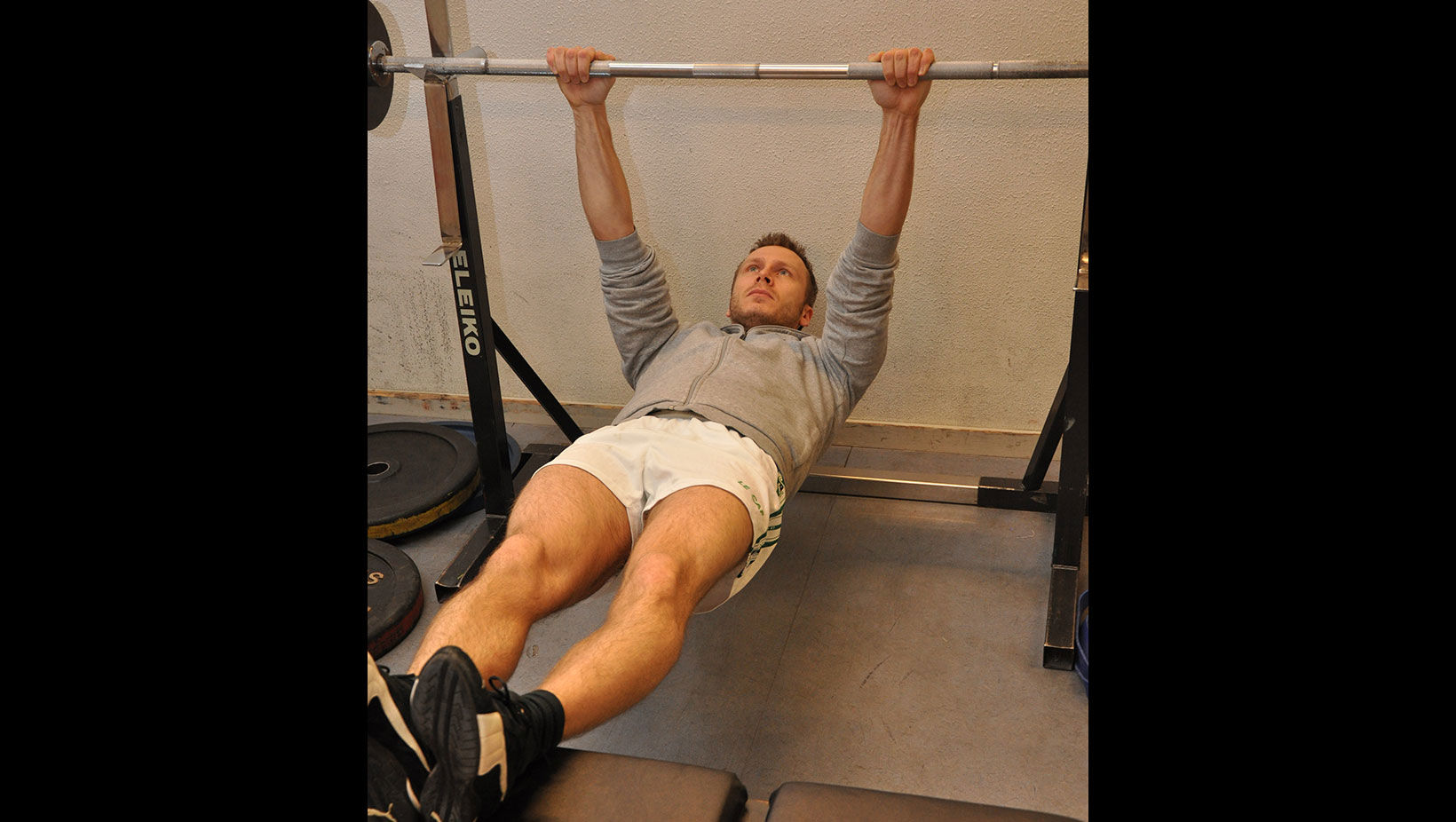 Gælder også ved træning af squat, dødløft og kropshævninger. Træk vejret ind før den koncentriske fase af løftet, hold det eller pust langsomt og kontrolleret ud, mens du løfter, aktivér den eccentriske fase af løftet tilbage til startposition og gentag proceduren for hvert enkelt rep. Se ordbogen for koncentrisk og ecentrisk muskelarbejde.